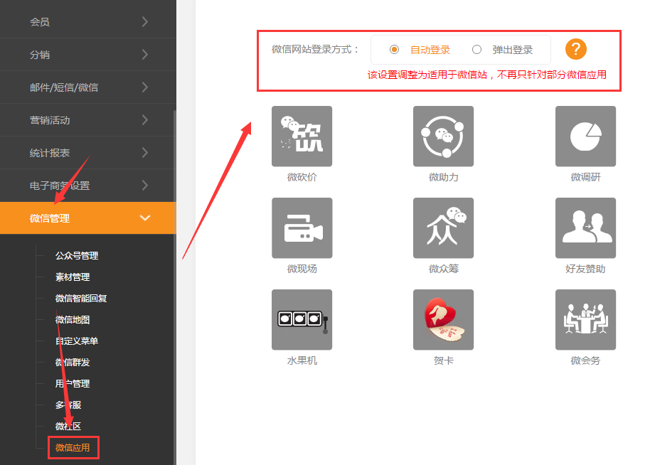 ①.原本的微信应用登录方式设置改为针对微信站,默认是自动登录,必须是认证过的服务号才可以使用此功能