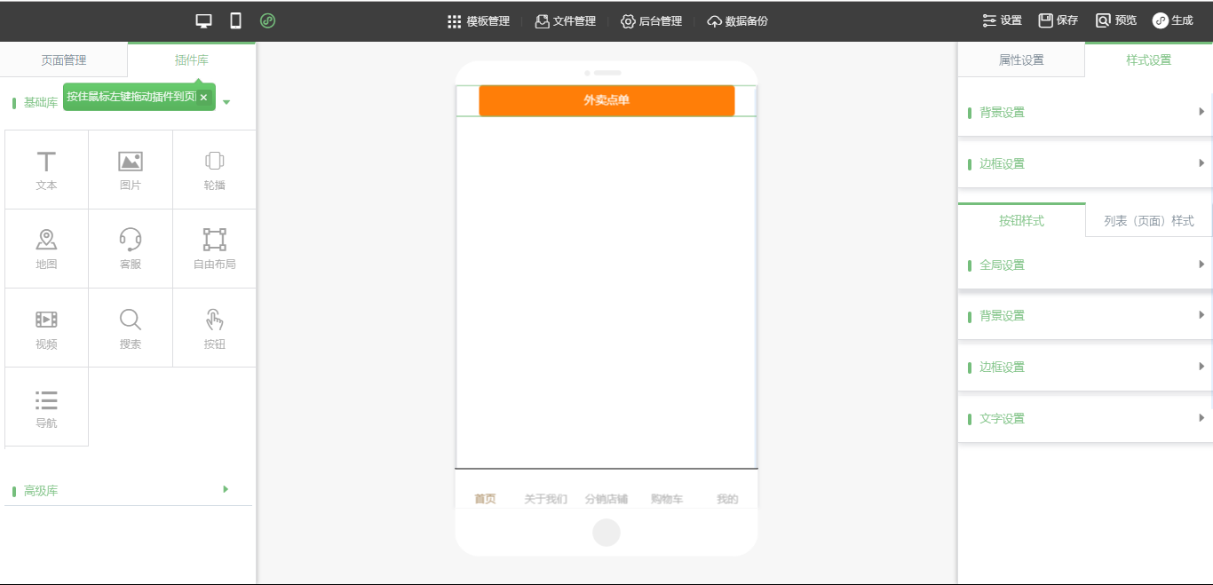 4.在小程序编辑页面,拖入“外卖点单”插件,可以对该插件进行“属性设置”及“样式设置”,设置完成后,点击保存即可,如图所示: