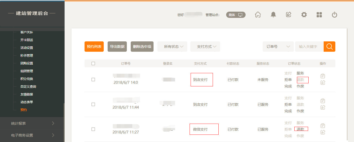 7.后台“订单列表”中可以操作前台提交的订单状态,比如:“支付”“服务”“拒单”等,需要注意的是,当“支付方式”为“无需支付”或“线下支付”时“退款”项不能操作,如图所示:
