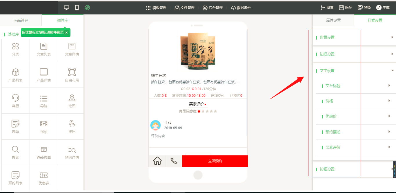 9.在编辑器中,拖入一个“预约详情”的页面,里面的内容为预约的详情信息,在“属性设置”中同样有“显示设置”;在“样式设置”中可以进行文字以及按钮等设置项的设置,如图所示: